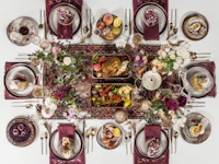 A full multi course seasonal evening with wine, cocktail and non alc elixir pairings. Tablescape with textiles and flowers.